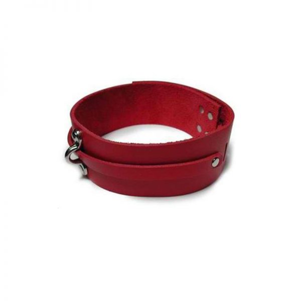 Soft, sturdy leather bondage collar with a flattering and comfortable wraparound design that stays on with no buckles to catch the hair. Stays on securely by itself for serious play or pass a padlock through the keeper loop. Fits necks 12 to 17 in.
