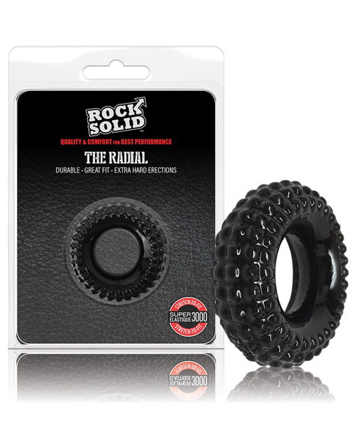 THE RADIAL: Our hip roadster model will leave you riding high in a phthalate-free Super Elastique 3000 elastomer. Super Elastique 3000 stretch-to-fit is very durable, provides a great fit, and helps maintain extra hard erections. Rock Solid cock rings combine quality and comfort for your best performance. This erection ring comes in colors black and clear. The Radial cock ring: tread shape and hip look. compatible with silicone personal lubricants, easy to clean with soap and water